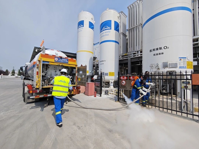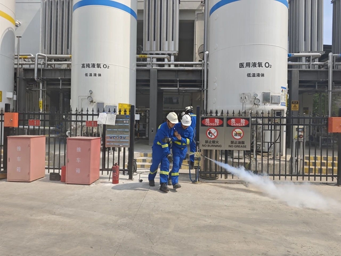 此次演练模拟两处突发险情,模拟场景一为生产区域内医用氧储罐在检修过程中电气起火,储罐根部管道泄漏,出现人员轻伤。模拟场景二为危化品运输车在满载氢气瓶情况下相撞起火,气瓶发生泄漏,存在爆炸风险。