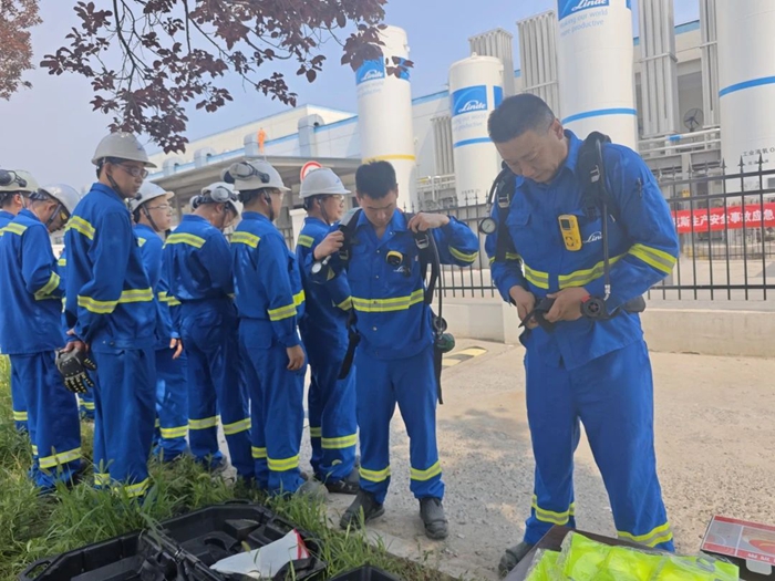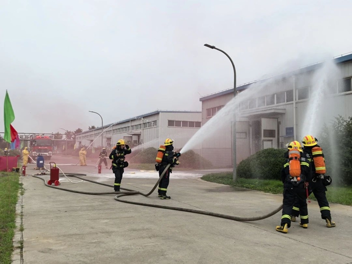 本次演练模拟场景为危化品库房乙醇胺出库作业时,因操作不慎导致泄漏,在处置过程中突发火情。演练中,两名库管员发现料桶“倾覆”后,立即穿戴防护装备开展“泄漏”处置并上报应急办公室和部门负责人。收到事故报告后,相关负责人立即调动微型消防站人员到现场开展处置。在“火情”进一步扩大后,应急值班员第一时间拨打119请求支援。双方协同作战,历经近40分钟紧张“救援”,“火势”得到控制并最终扑灭。安全人员全面排查确认无隐患后,宣告演练圆满成功。