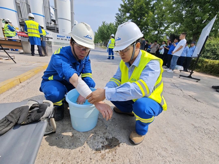 演练过程中,北普公司应急指挥部立即启动应急预案,面对“险情一”,北普公司第一时间对受伤人员进行施救,应急小组成员分工开展应急处置,及时控制泄漏,解除风险;面对“险情二”,第一时间联系消防人员开展危化品车辆灭火、氢气瓶泄漏处置,严格按照企业自救、处置移交、火场侦察、警戒封控、疏散救人、稀释驱散、现场处置、危险转运等8项流程予以“施救”。