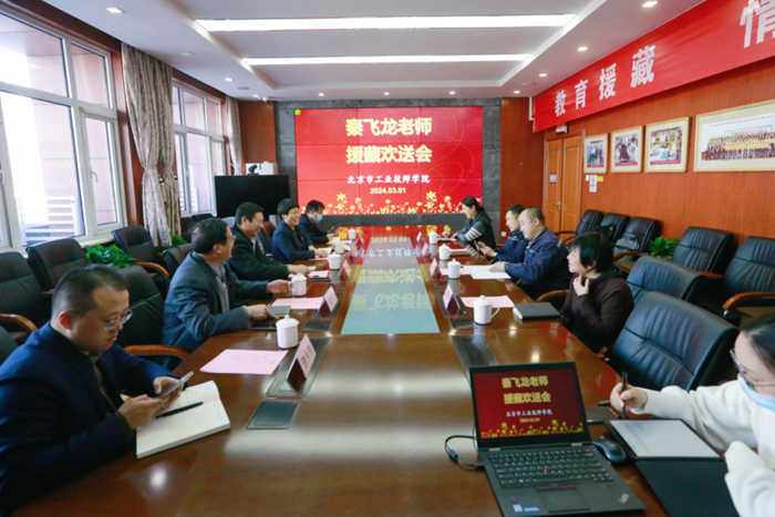 在启程前,技师学院举行秦飞龙老师援藏欢送会。江南(中国)党委常委、组织部部长刘士义代表集团党委欢送秦飞龙老师。技师学院有关领导、相关部室和专业系负责人参加欢送座谈。