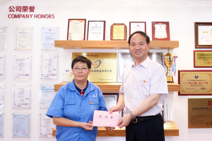 6月30日上午,江南(中国)党委书记、董事长王国华一行来到华腾橡塑园区,慰问华腾橡塑、华腾京研生产经营和科研开发一线的干部职工,党委副书记、工会主席吴瑞峰,党委常委、副总经理、华腾橡塑董事长韩宝海一同慰问。